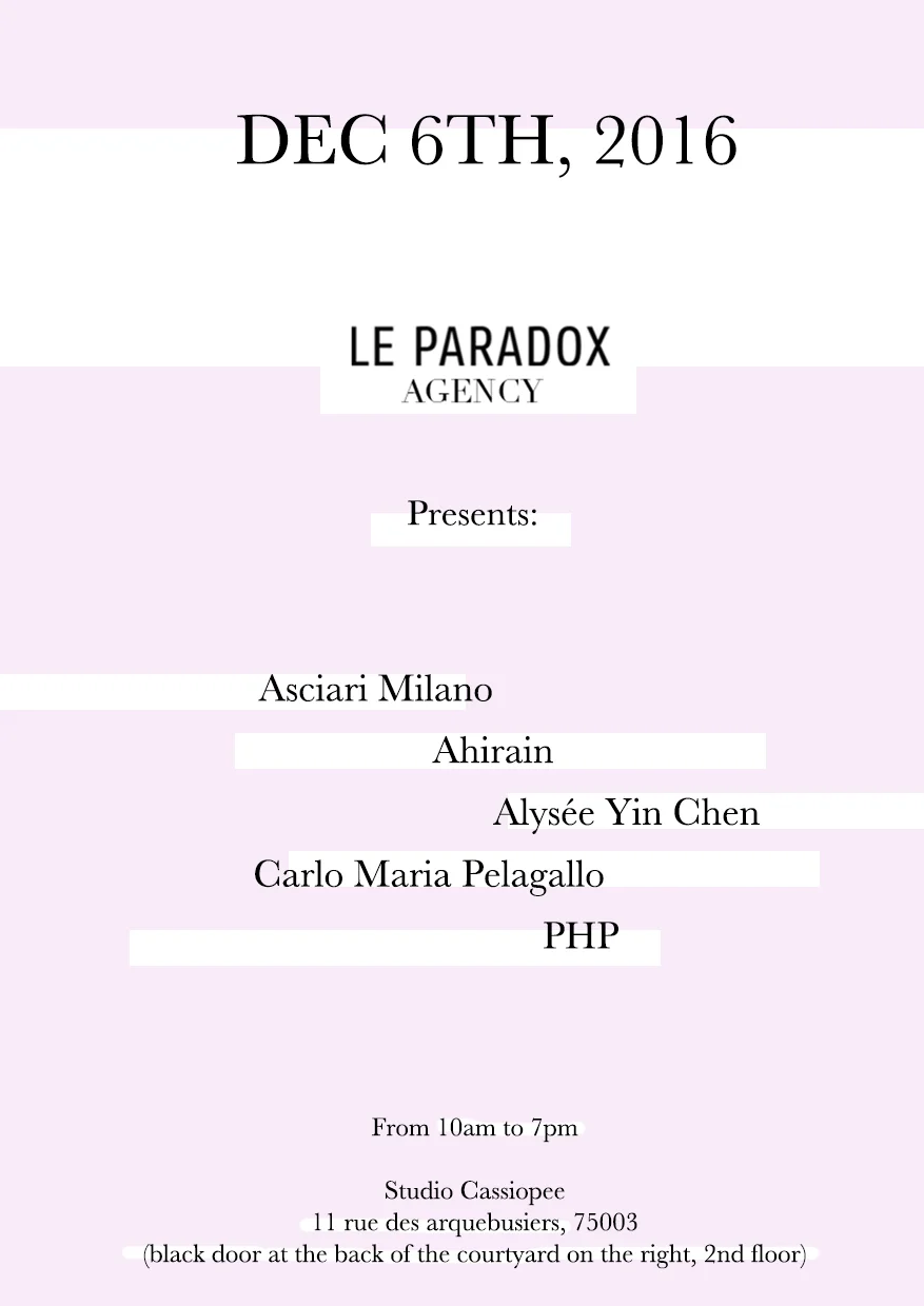 Dec 6th, 2016 LE PARADOX AGENCY Presents: Asciari Milano, Ahirain, Alysée Yin Chen, Carlo Maria Pelagallo, PHP.